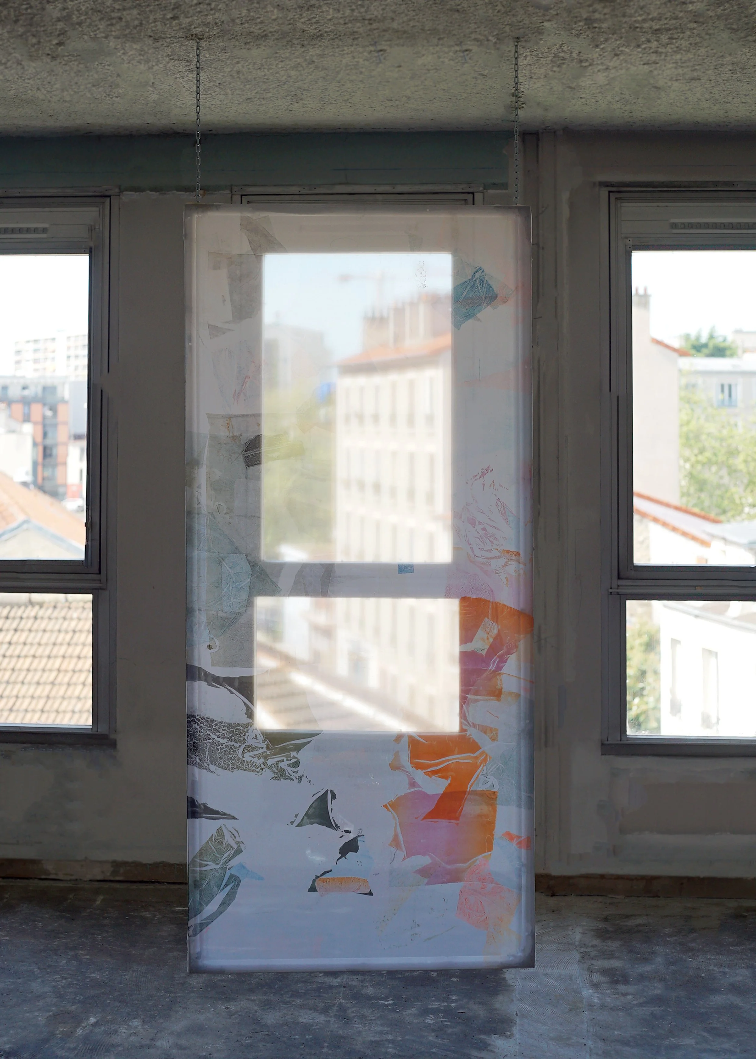 Mollie Burke’s work explores states of affect, the experience of self and place, and the notion of networks. She creates archives from online digital texts and collected waste, bringing them into dialogue through diverse techniques. Currently in residence at Fiminco in Romainville, she continues her methodical gathering of objects during wanderings through peripheral, transforming areas, as well as post-industrial and construction sites. Abandoned consumer packaging is reworked through print processes, its trace transferred onto silk fabric. Their presence, and the histories they carry, emerge subtly, like a watermark or palimpsest.